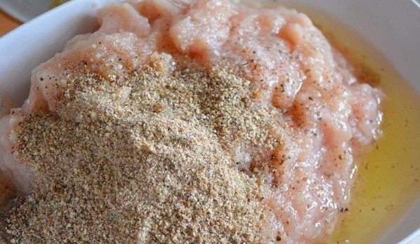 К куриному фаршу добавить белки, панировочные сухари, соль, перец и любимые специи. Соли лучше много не класть, так как бекон даст свою соль. Вымесить фарш до однородности. Отбить хорошо, чтобы он стал плотнее.
