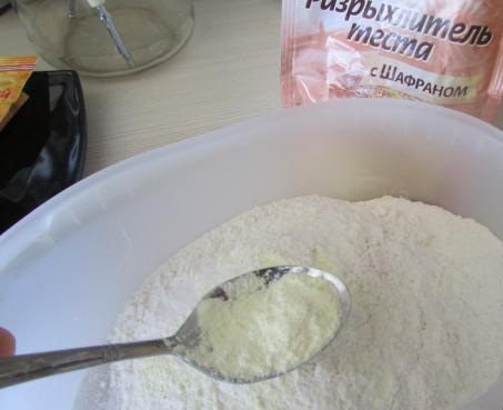 Смешиваем сухие ингредиенты - муку, разрыхлитель и сахарный песок.