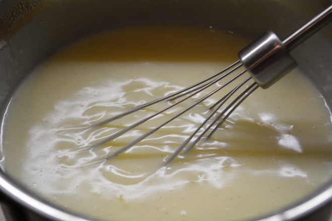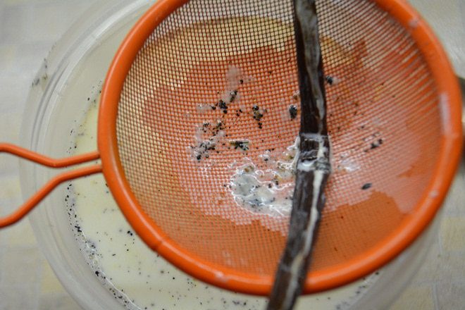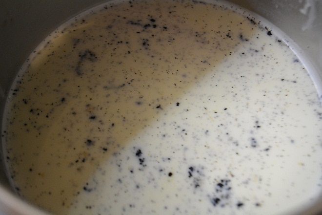 Тем временем займемся кремом: смешать в сотейнике молоко со сливками. Стручок ванили разрезать вдоль, извлечь семена ножом. Добавить семена и стручок в сотейник и довести до кипения. Снять с огня, закрыть крышкой и дать настояться 15 минут.