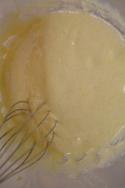 Желтки взбить с сахаром до белой массы, добавить крахмал и снова перемешать венчиком.