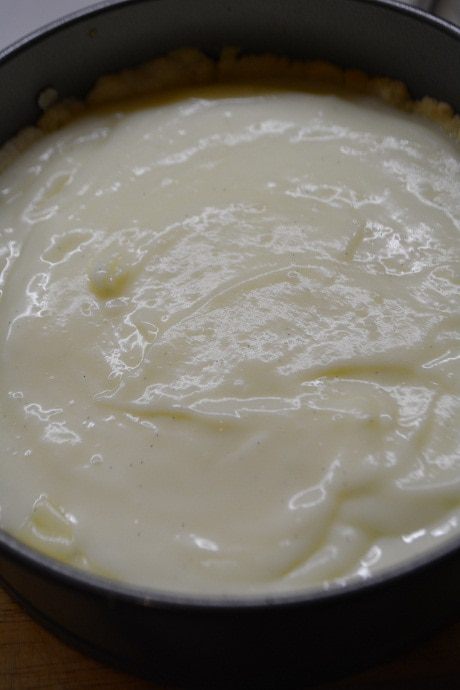 Достать форму с тестом. Печь убавить до 180 градусов. Выложить начинку-крем и запечь еще 30 минут до золотистого цвета.