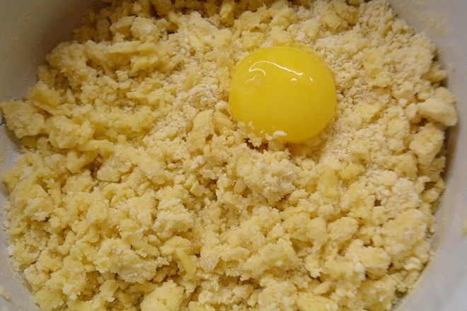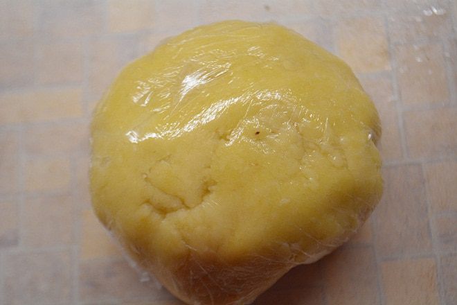 Замесить тесто, но долго не вымешивать. Собрали в комок и готово! Убрать в холодильник на 30 минут.