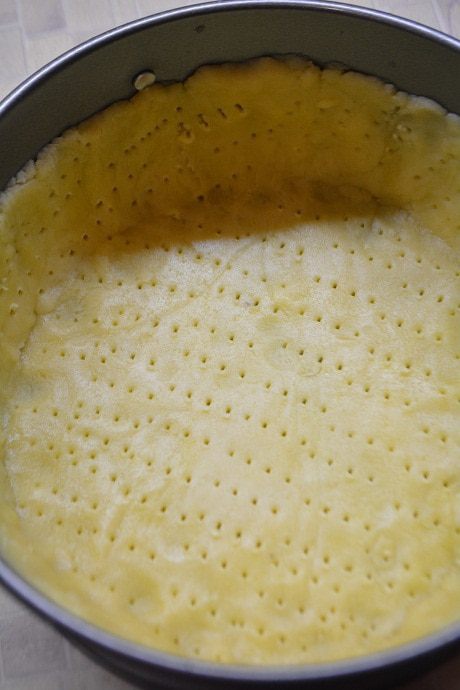 Достать тесто из холодильника. Выложить в форму, дно у которой выстелить пекарской бумагой... Сформировать высокие бортики и наколоть всю поверхность теста вилкой. Выпекать при Т 200 градусов 5 минут.