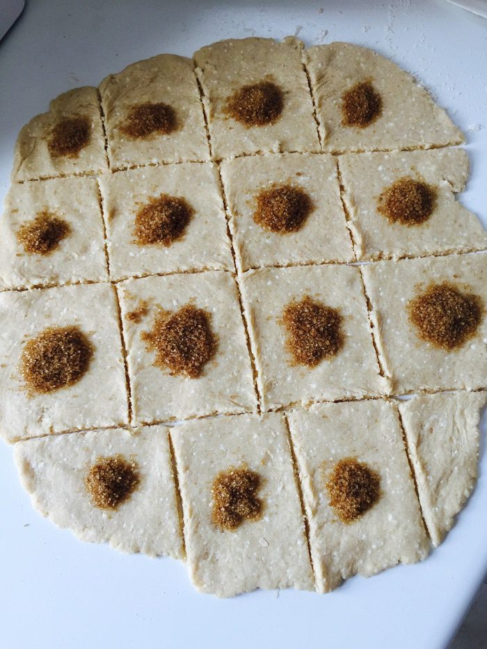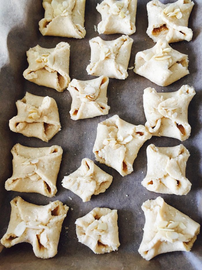 Складываем сегменты в конвертики, защипываем противоположные уголки. Замечу, что тесто у меня получилось не самое податливое - от того и вид немного пострадал. Но не вкуууус ;) Центр конвертиков украшаем миндальными лепестками, чтобы хоть как-то спасти ситуацию ;)