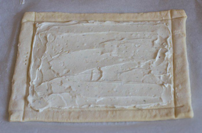 Сделать на тесте бортики при помощи ножа, не дорезая до конца. По центру равномерно нанести сырную начинку.