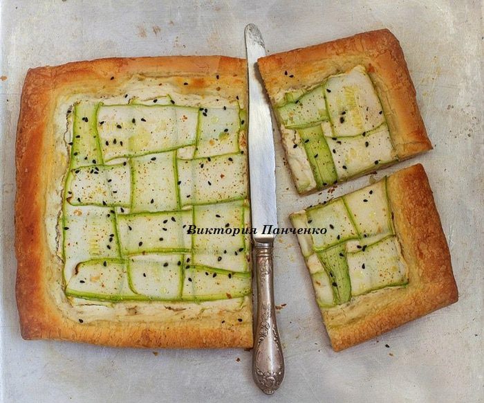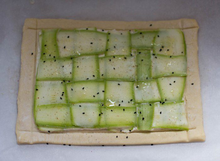 Цукини (или кабачок) нарезать тонкими пластиками. Выложить на начинку в виде плетенки. Сбрызнуть оливковым маслом, посыпать черным тмином