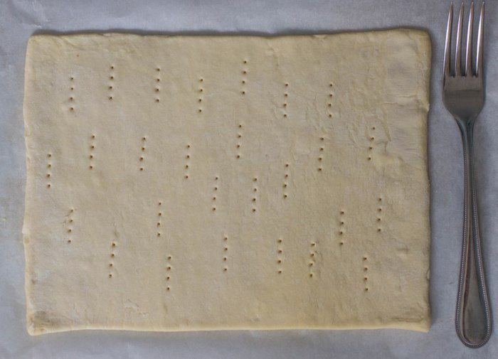 Разморозить слоеное тесто при комнатной температуре. Раскатать, придав форму прямоугольника, сделать наколы вилкой