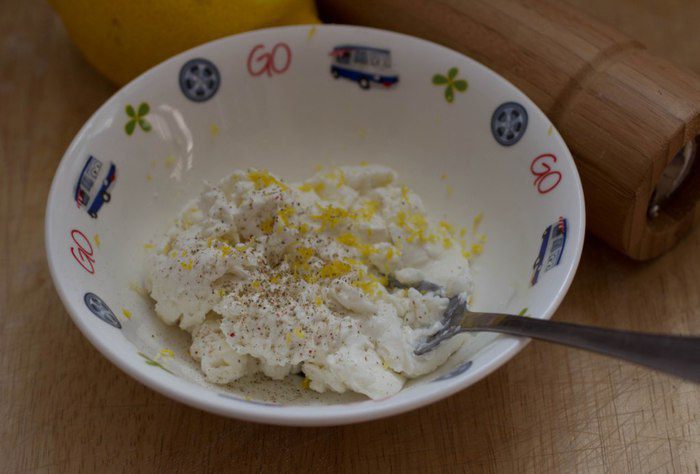 Творожный сыр (у меня каймак) смешать с цедрой, приправить солью и перцем по вкусу