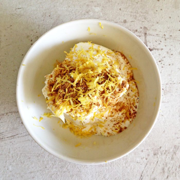 Для крема смешиваем маскарпоне, сметану, цедру лимона и кориандр.