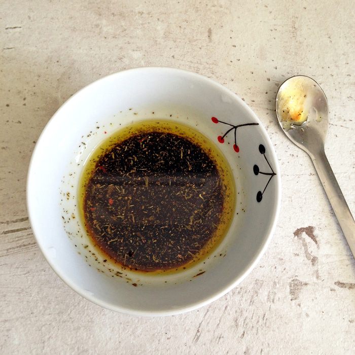 Готовим маринад для свеклы: смешиваем оливковое масло, бальзамик и мед. Добавляем щепотку тимьяна, солим и перчим по вкусу.