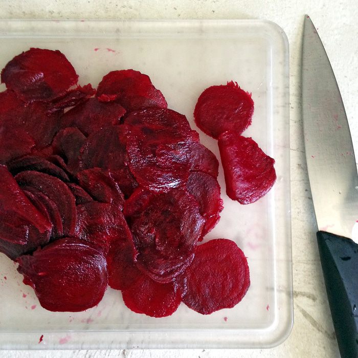 Свеклу нарезаем очень тонкими кружочками.