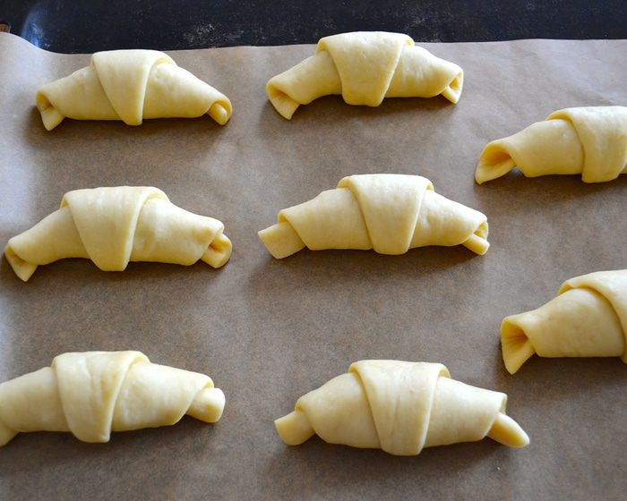 Выложите рогалики на застеленный пекарской бумагой противень и дайте постоять, накрыв полотенцем 10 минут. За это время включите прогреваться духовку на 190-200 градусов. Через 10 минут с помощью кисточки смажьте рогалики сливками (или яичным белком, кому как больше нравится!)