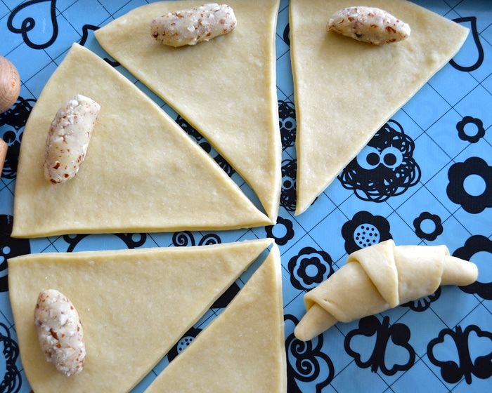 Из каждого кусочка марципановой начинки скатайте маленькую колбаску и выложите на тесто с более широкого конца. Сверните рогалик, наподобие круассана. Таким же образом приготовьте все остальные рогалики.