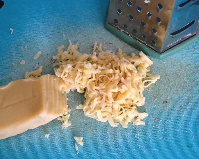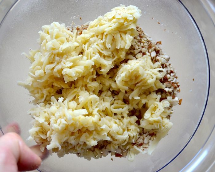 Тем временем приготовьте начинку. Марципановую массу натрите на крупной тёрке, миндаль измельчите ножом (или в блендере), но чтобы получились достаточно крупные кусочки.