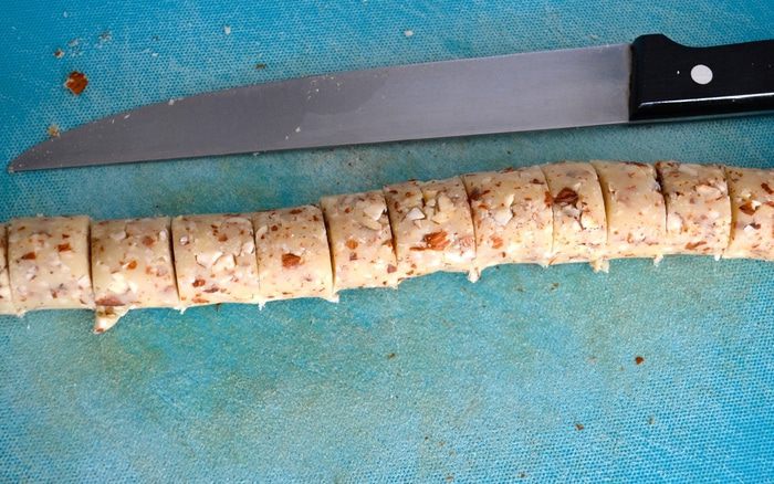 Раскатывая по столу полученную массу, сформируйте из нее колбаску и нарежьте её на 16 ровных частей (по количеству рогаликов).