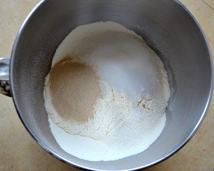 В большую миску просейте муку, добавьте сахар, ванилин, сухие дрожжи, щепотку соли и перемешайте.