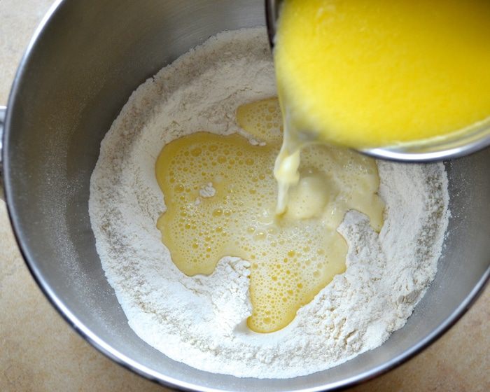 Слегка нагрейте молоко со сливочным маслом, чтобы масло растаяло. Молоко не должно быть очень горячим, но тёплым. Влейте масляно-молочную смесь в сухие ингредиенты, добавьте туда же яйцо и замесите тесто.