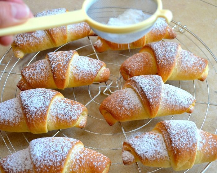 Готовые рогалики полностью остудите на решетке и присыпьте сахарной пудрой. Можно еще приготовить помадку и смазать ею такие булочки-рогалики - получается необыкновенно вкусно!