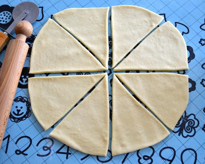 Выложите его на рабочую поверхность и разделите на 2 части (весом от 450 до 500 г). Одну часть теста раскайте в круг и разделите на 8 сегментов.