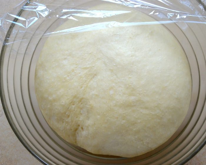 Выложите тесто в миску, слегка смазанную маслом. Накройте плёнкой и поставьте на 1 час в спокойное тёплое место. Я ставлю тесто на подъем в духовой шкаф (электрическая духовка), включив его в режиме "свет".