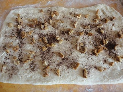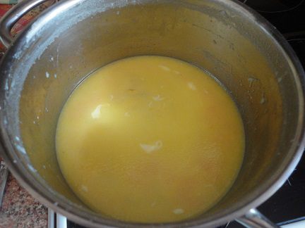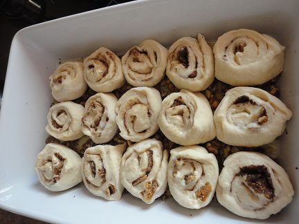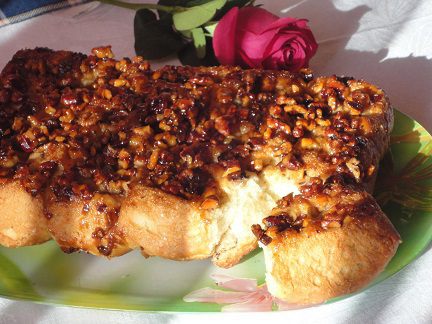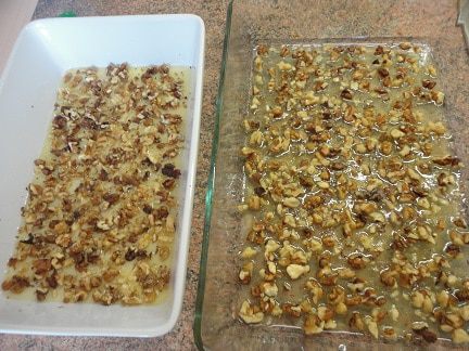 Орехи нарубить крупно, можно даже оставить четвертинки ядер. Смешайте воду, масло, сахар и мед. На медленном огне помешивайте только до растворения сахара. В глубокие формы для выпечки (можно и один большой глубокий противень) вылить сахарно-масляный сироп, выложить орехи.