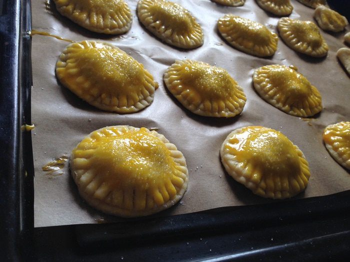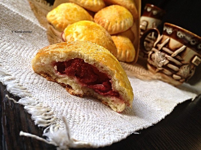 Желток взбить с молоком и смазать этой смесью пирожки. По желанию можно присыпать сахаром. Выпекать в предварительно разогретой духовке до 180 градусов 20-25 минут.