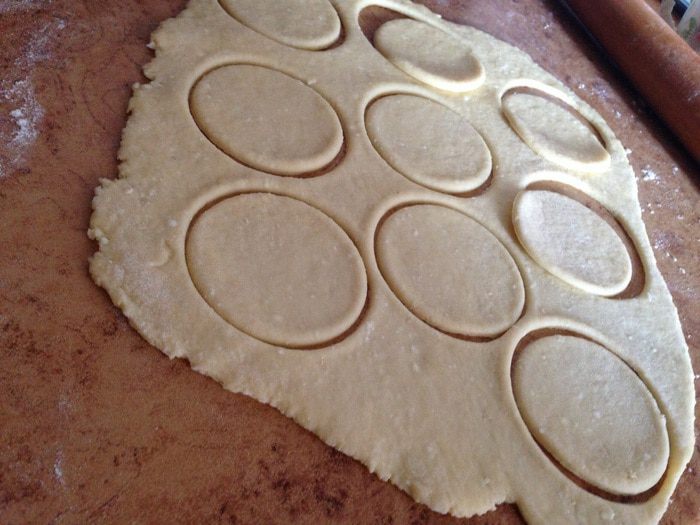 Раскатать тесто в пласт толщиной 3-5 мм. Вырезать формой кружки.