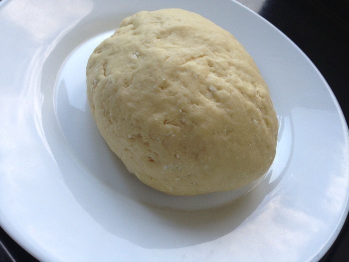 Всыпать просеянную муку с разрыхлителем и замесить тесто. Положить тесто на 20 минут в холодильник.