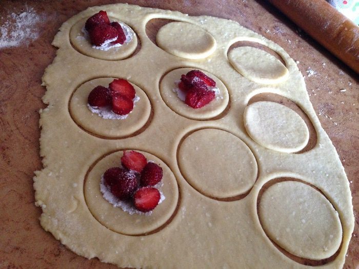 Центр половинки заготовок присыпать крахмалом, положить начинку (у меня клубника, примерно ушло грамм 100) и по необходимости начинку посыпать сахаром.