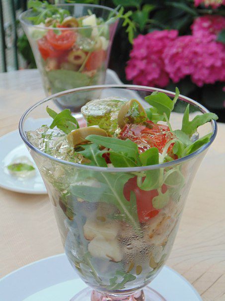 Салат-коктейль с курицей, сыром и кусочками винного желе