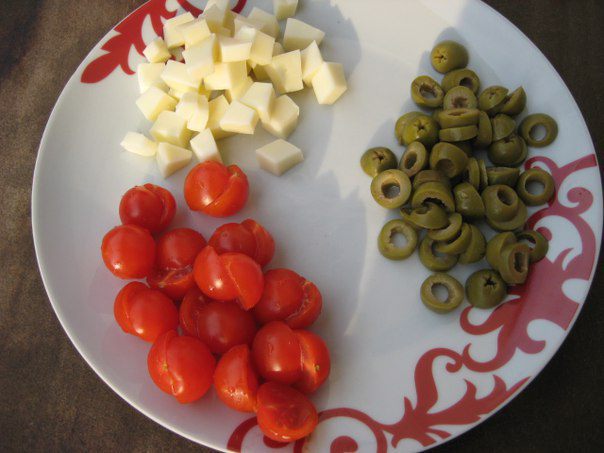 Сыр нарезать кубиками, помидоры черри пополам, оливки - колечками.