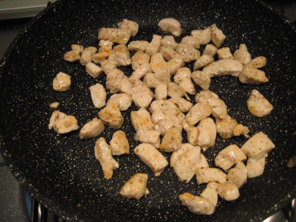 Куриное филе нарезать кубиками, удобнее делать, когда филе слегка подморожено, посыпать прованскими травами, обжарить на 0, 5 ст.л оливкового масла, посолить, переложить в тарелку.