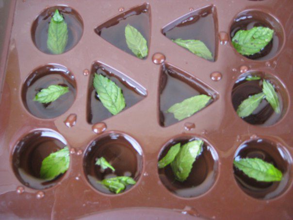 Вино нагреть, не кипятить! Всыпать желатин, когда желатин распустится, разлить по силиконовым формочкам, в каждую положить листик мяты (или петрушки).