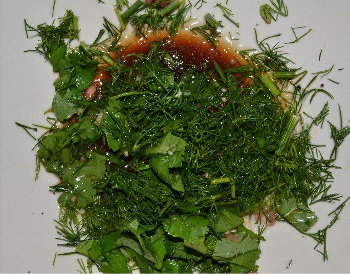 Готовим заправку: Все травы (базилик, кинза, чеснок, мята, укроп) измельчаем, добавляем оставшийся сок грейпфрута, бальзамический уксус и немного сока лимона, оливковое масло. Все перемешиваем вилкой и заправляем салат.