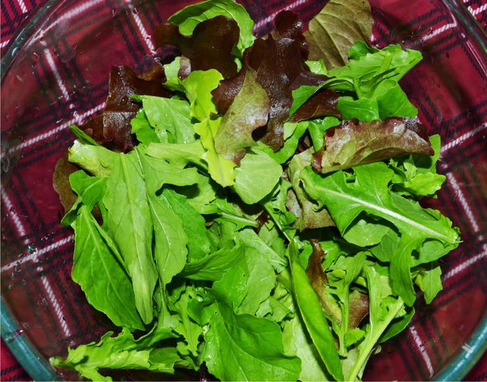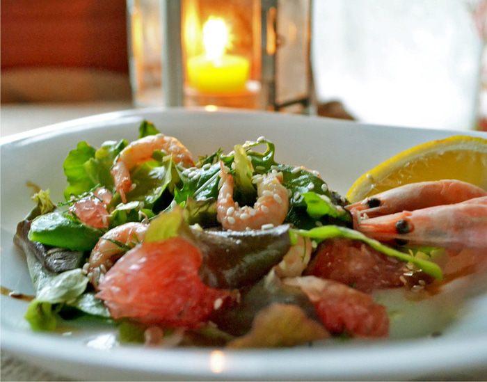Салат и руколу выкладываем на блюдо, добавляем грейпфрут, маринованные креветки.