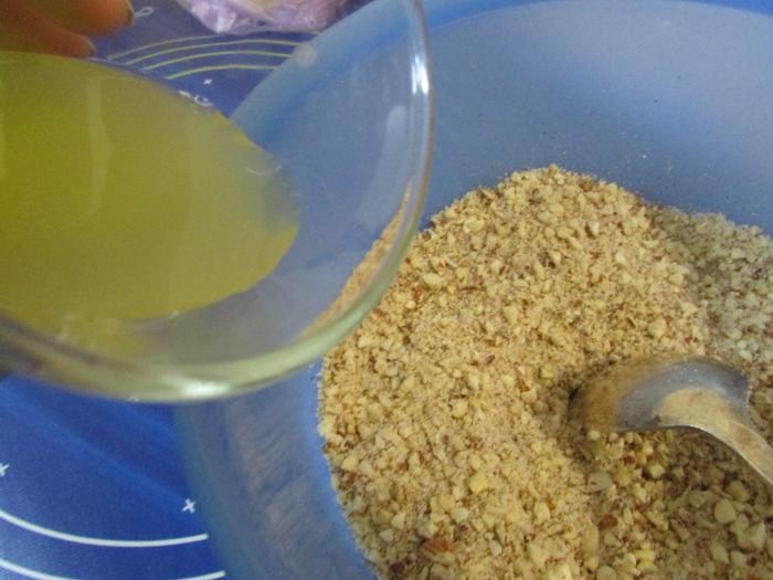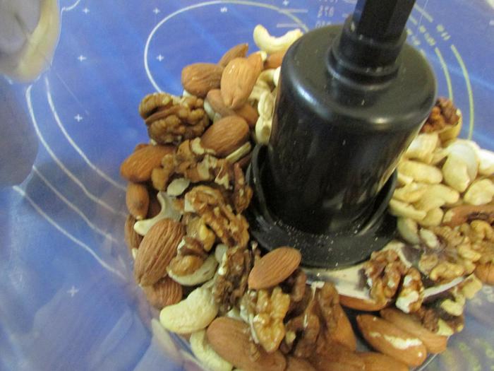 Приготовить начинку. Орехи (у меня смесь: миндаль, кешью, грецкий) выложить в чашу блендера. Смолоть в крошку.