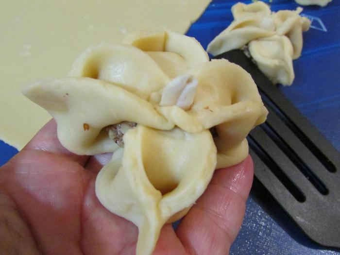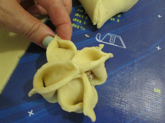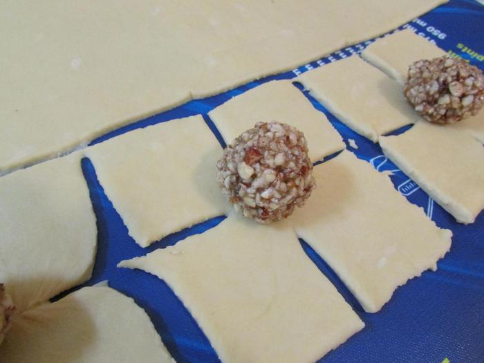 Из начинки формовать маленькие плотные шарики. И выложить их в середину квадрата.