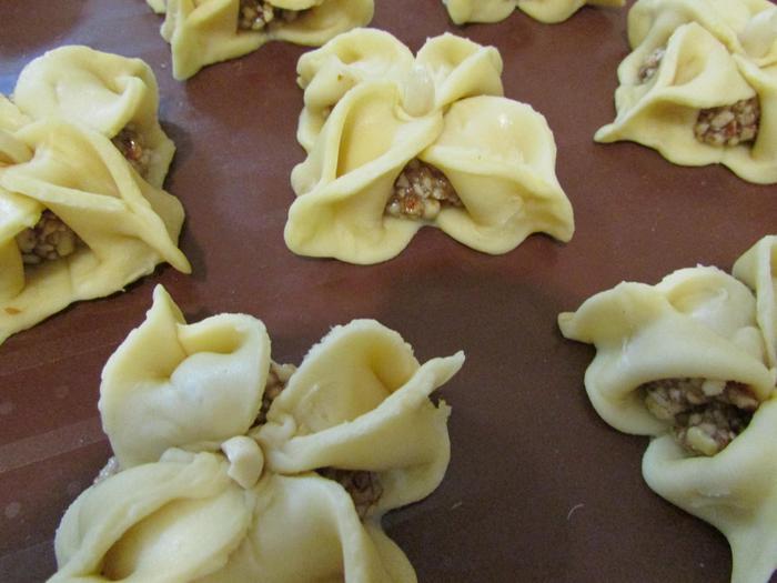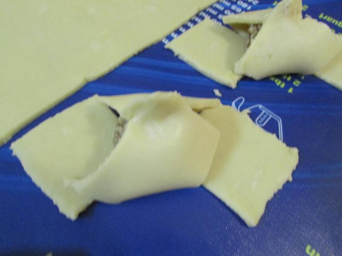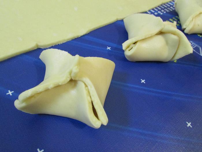 Тесто тонко раскатать (муку не подсыпать). Нарезать на квадраты (10x10). В середине каждого квадрата сделать надрезы к центру, каждый надрез - примерно 3 см.
