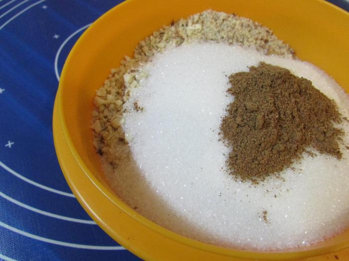 К орехам добавить сахар, корицу и хорошо перемешать.
