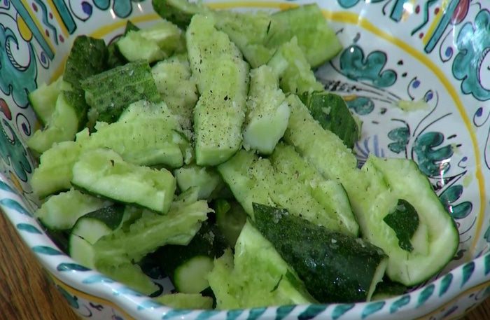 Выложить измельченные огурцы на блюдо, посолить и поперчить.