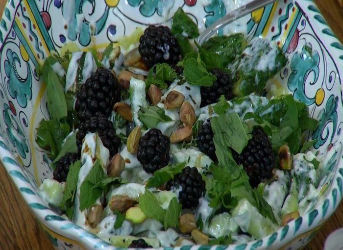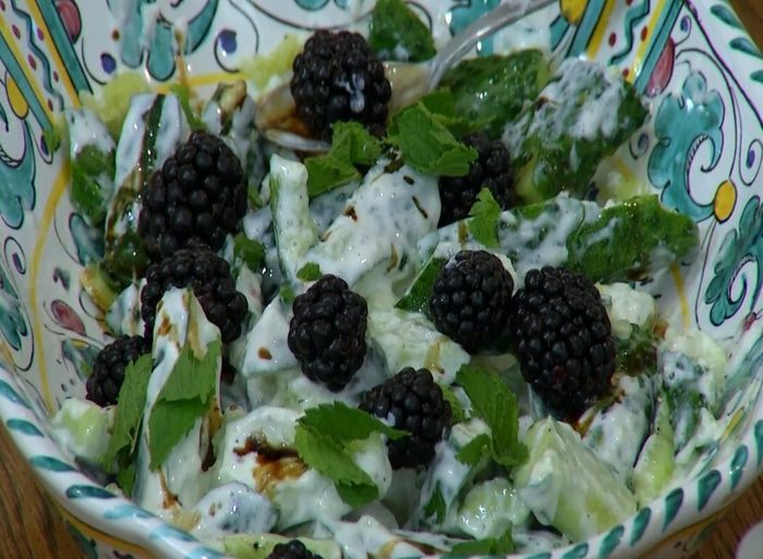 Разложить на огурцы ежевику, посыпать салат порванными руками листьями мяты и базилика, а затем листьями тимьяна.