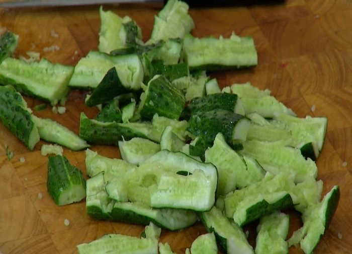 Огурцы, срезав кончики, поместить на рабочую поверхность и поколотить скалкой, если остались крупные части — порезать их.
