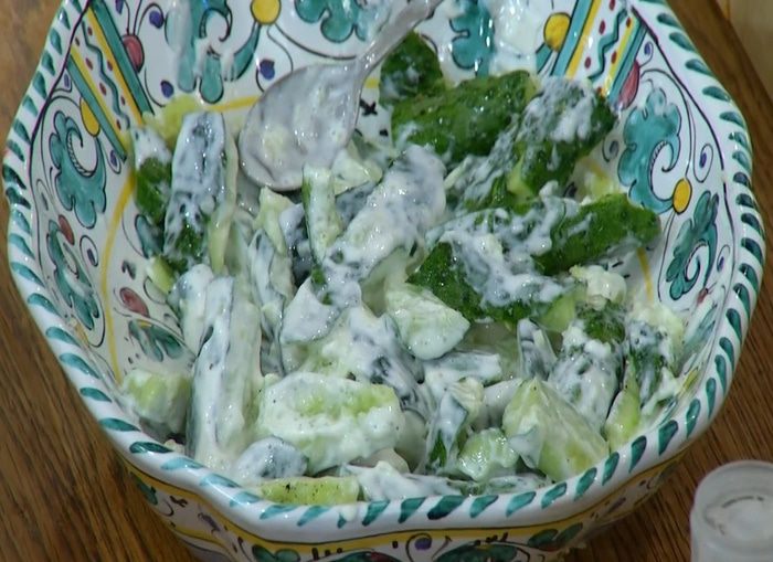 Добавить йогурт и перемешать, затем полить огурцы наршарабом.