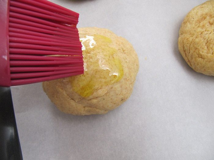 Из теста сформируйте булочки. Получается 6 шт. Аккуратно кисточкой обмажьте оливковым маслом.