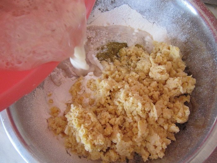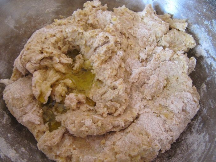 Перемешайте. Добавьте оливковое масло и замесите тесто. Месите примерно 5 минут.