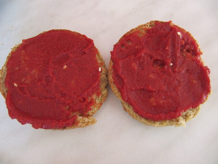 Затем готовые булочки разрежьте пополам, смажьте соусом.