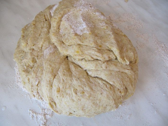 Выложите тесто на стол присыпанной мукой. Намажьте руки маслом, чтобы тесто не прилипало и месите тесто.
