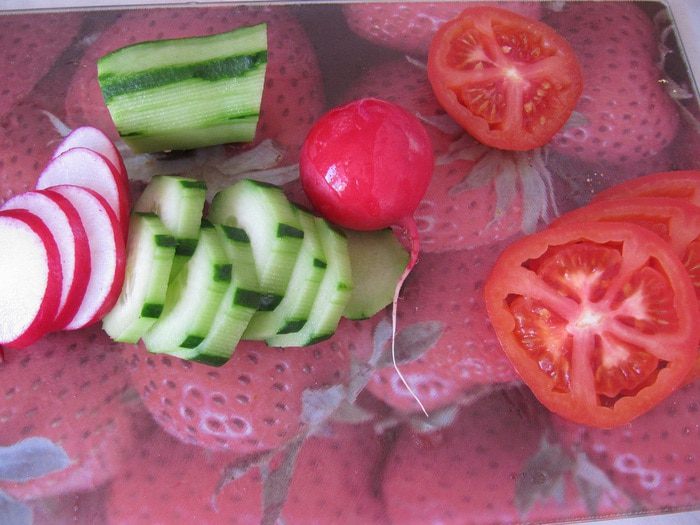 Выложите овощи помидор, огурец, редис и зелень. Вот и готово! Приятного аппетита!!!