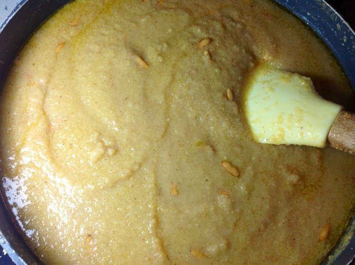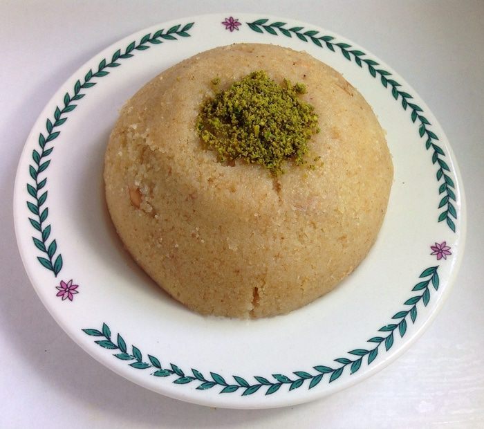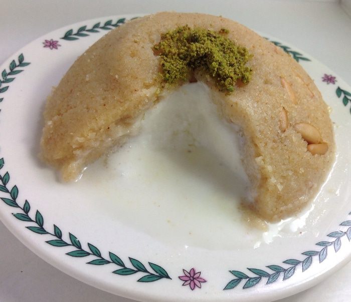 Летний вариант - с мороженым: глубокую миску небольшого размера (например, пиалу для чая) застелить изнутри пищевой пленкой. Выложить халву примерно на 1/3 миски, слегка утрамбовывая ложкой, делая бортики по стенкам посуды. Далее положить мороженое еще на 1/3 посуды (в данном случае – ванильное, но можно использовать любое). Затем заполнить до верха халвой – еще на 1/3 посуды. Верх разровнять. Затем резко опрокинуть вверх дном на плоскую тарелку и аккуратно снять миску вместе с пленкой. Получится ровная круглая горка с мороженым внутри. Посыпать фисташковой мукой. Здесь очень интересное сочетание горячей халвы и холодного мороженого. Подавать необходимо сразу же.