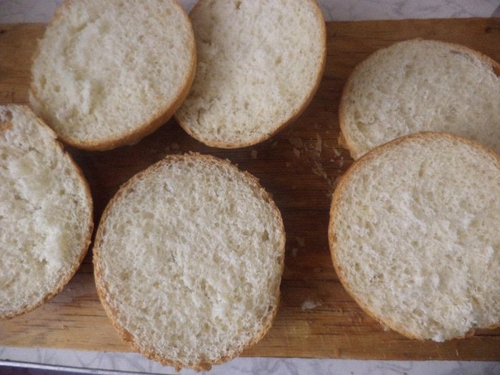 Булочки разрезать пополам, слегка подсушить в духовке, разогретой до 180 градусов.